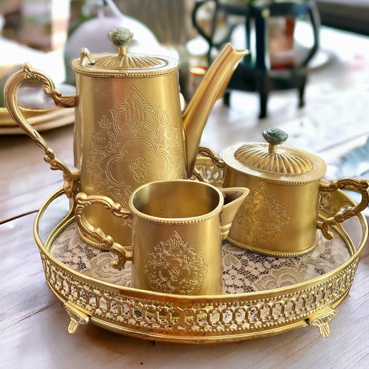Méhfil-é-Jashn Vintage Gold with Rose Quartz - 3 piece tea set made in brass