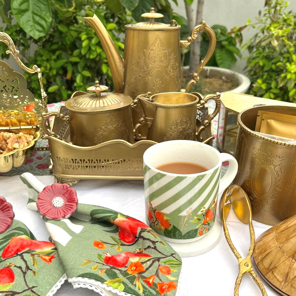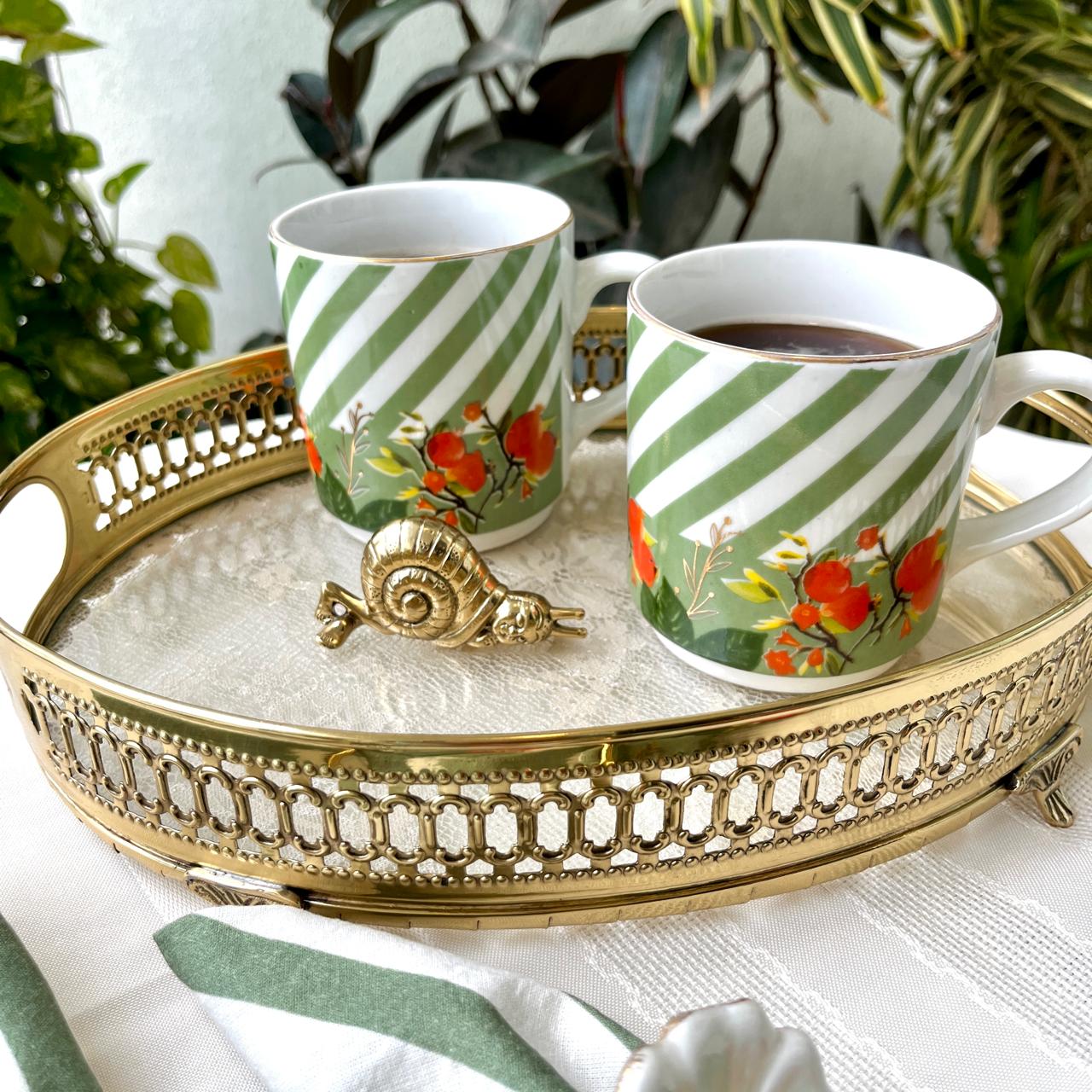Báagh, aptly named porcelain coffee mug features an exquisite and lively design that combines modern aesthetics with luxurious details. The upper section of the mug is adorned with diagonal green and white stripes, giving it a fresh and contemporary appearance. Below these stripes, a charming pattern of bright tangerines, is depicted alongside green leaves and delicate branches, adding a vibrant and botanical touch.