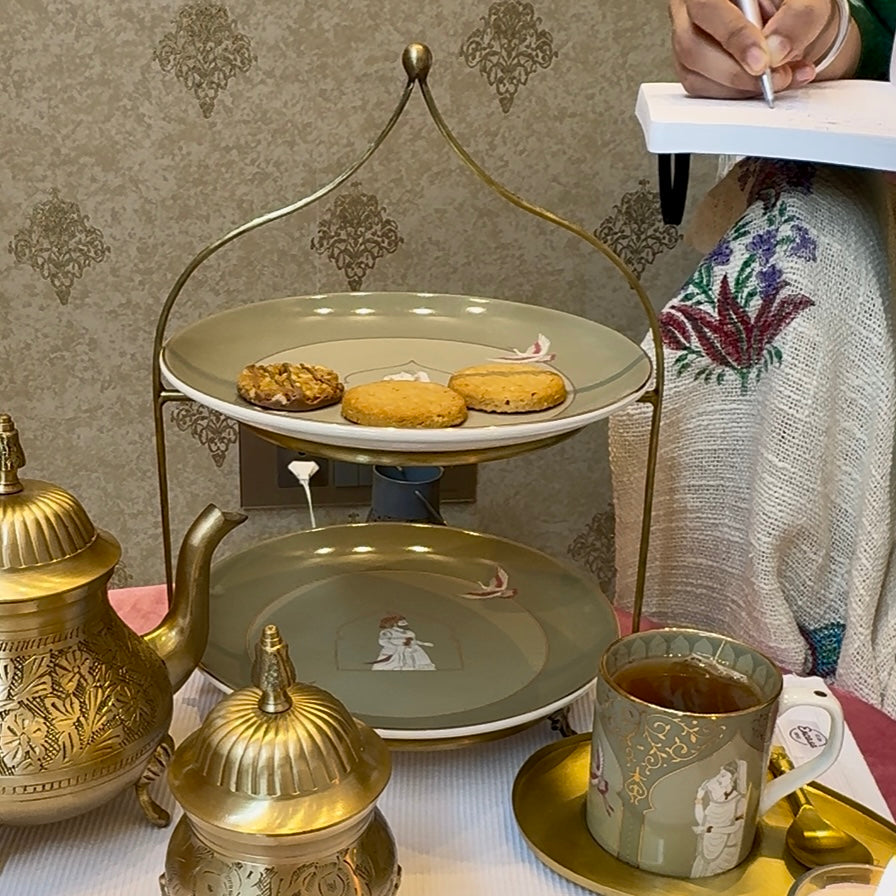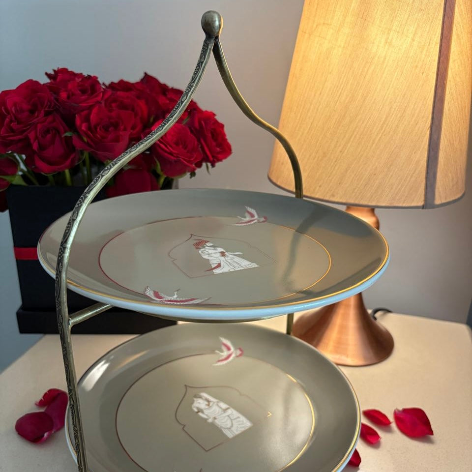 Elevate your serving experience with the Behruz Two-Tier Platter, a seamless blend of elegance and craftsmanship. The sturdy brass frame features delicate embossed detailing, providing a regal structure for the two-tier design. Each porcelain plate is adorned with intricate motifs and accents of 24 kt pure gold, reflecting a subtle opulence that complements any table setting. Perfect for serving sweets, pastries, or savory delights, this platter transforms everyday gatherings into memorable occasions.