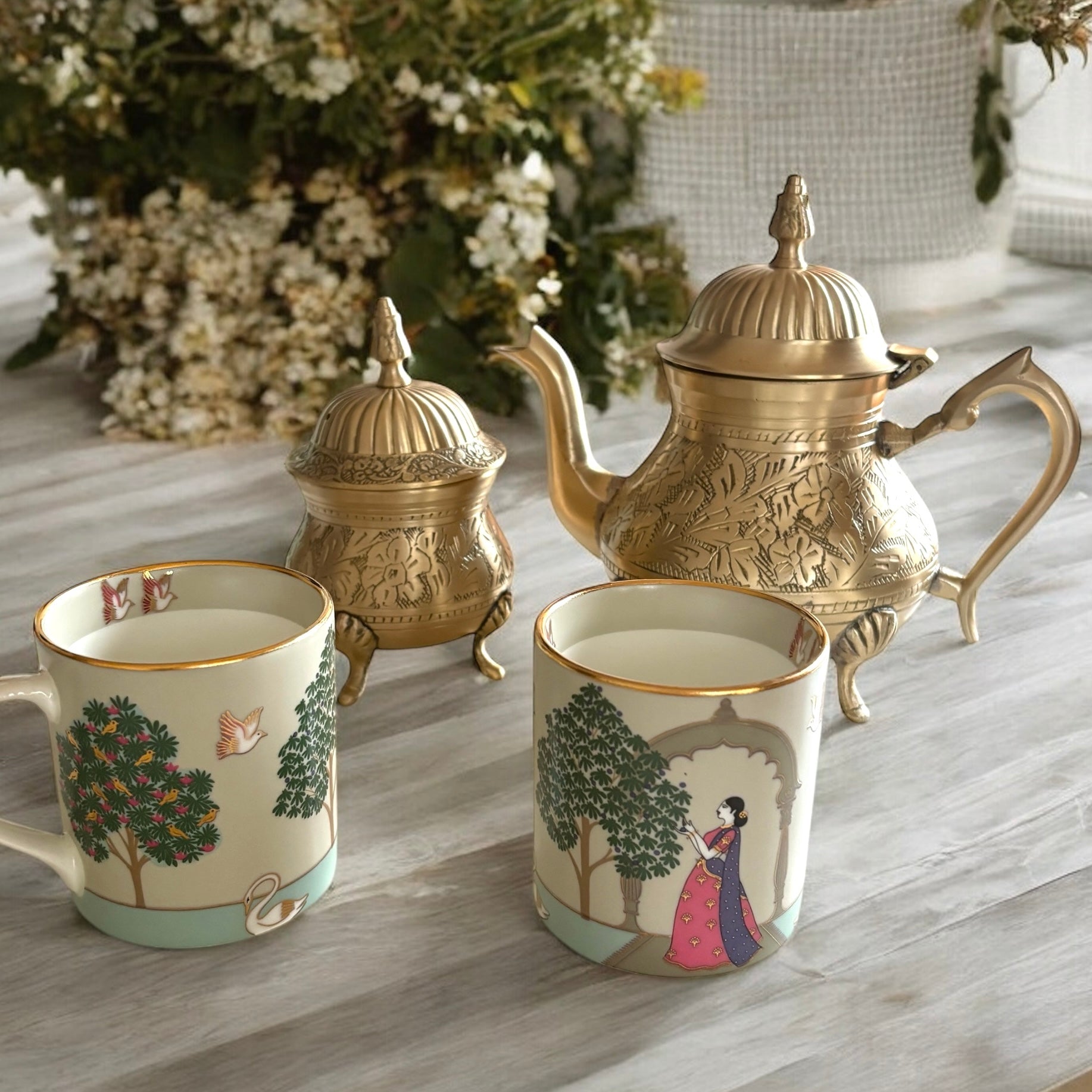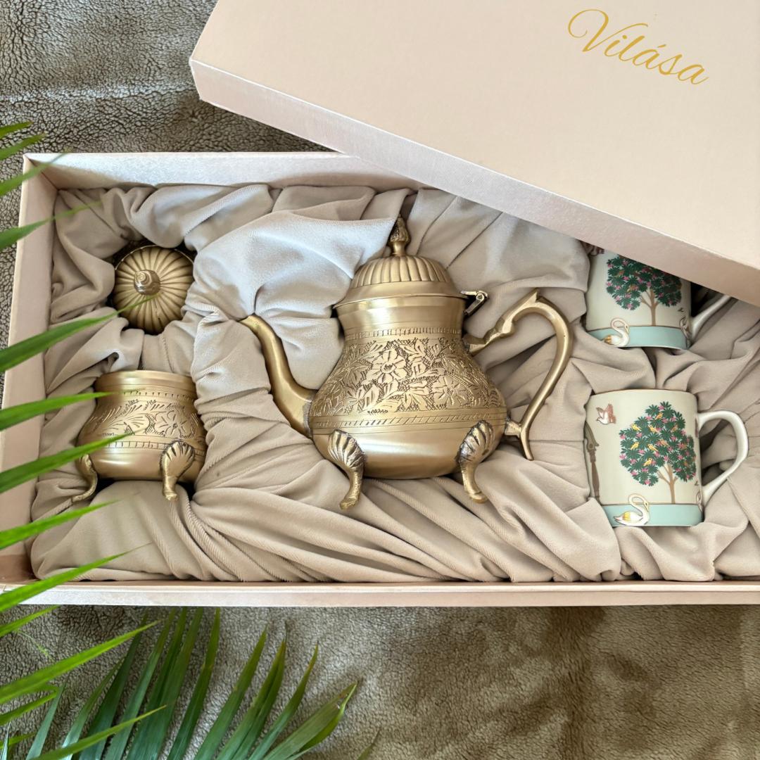 Mehfil-e-Dastoor with Firdaus - A 4 pc set with Brass Kettle & sugarpot and 2 porcelain cups