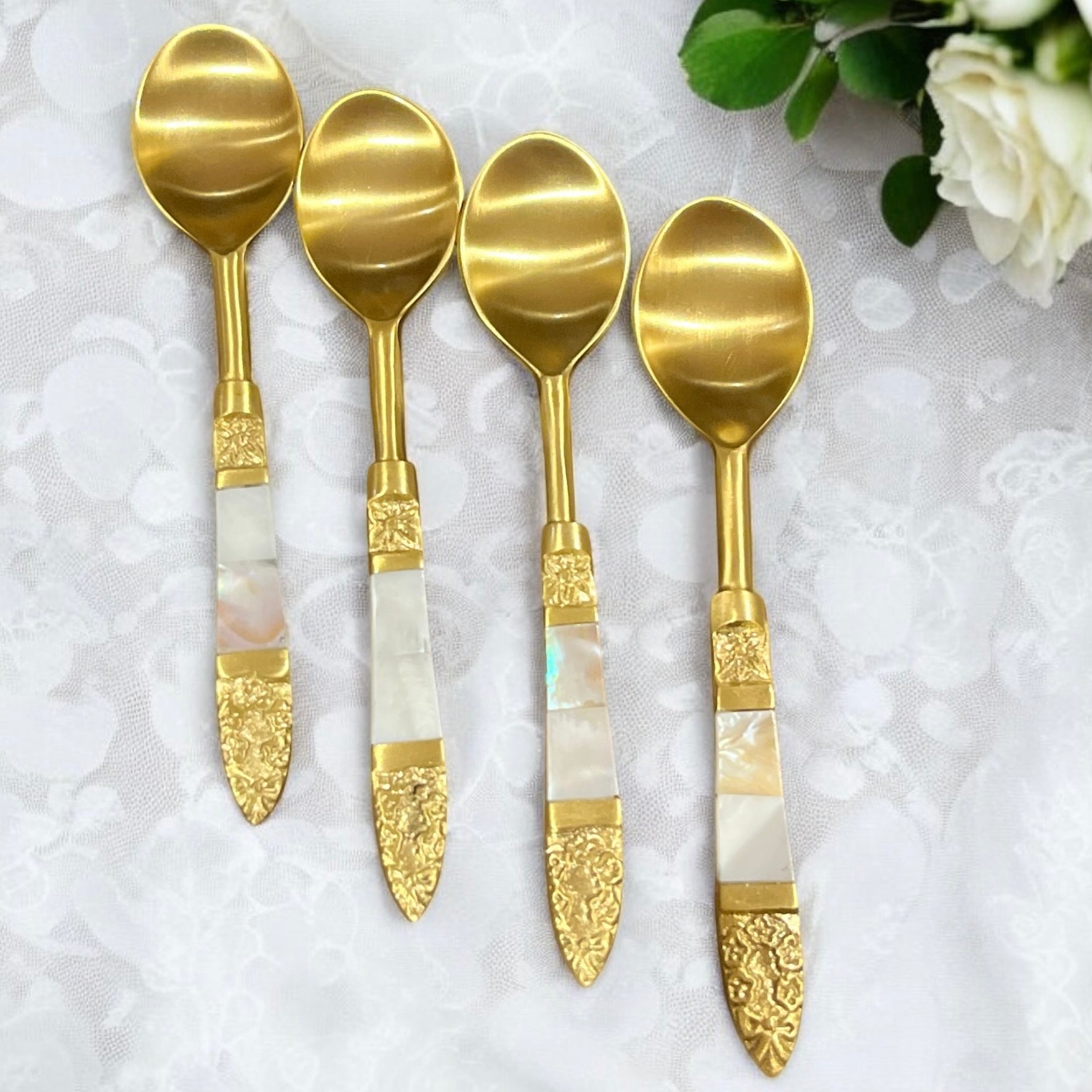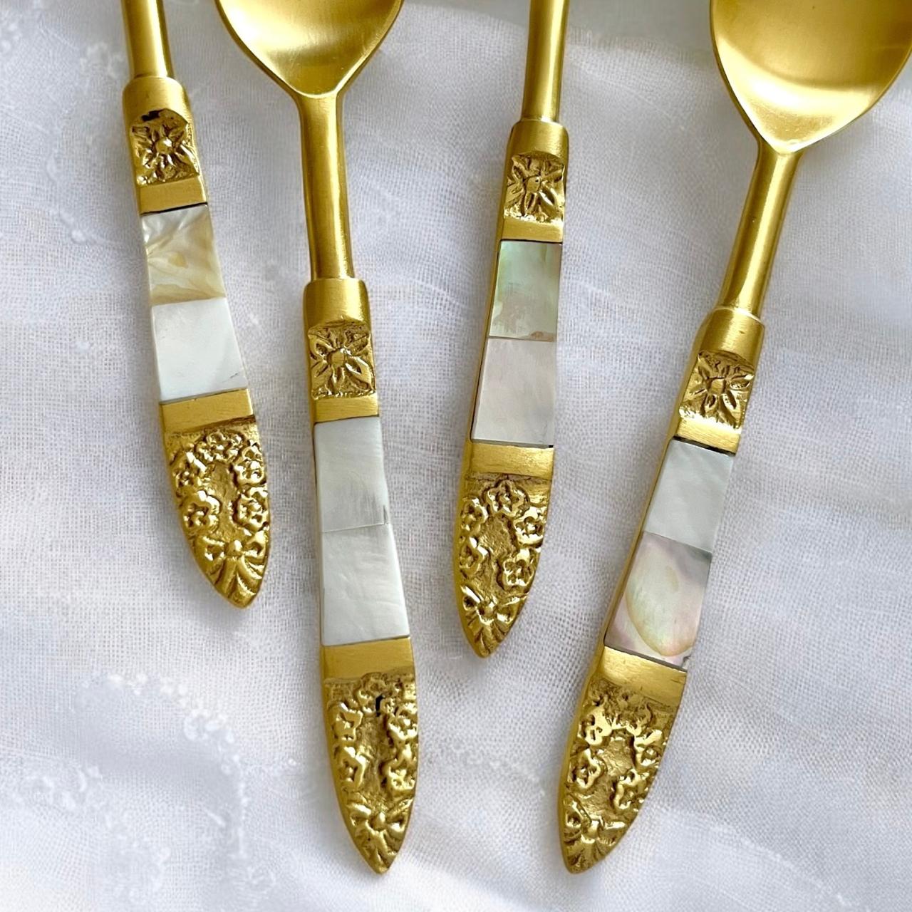 Mitháas Naqashi Gold - Elegant Brass Dessert Spoon Set with Mother of Pearl Handles (Set of 4)