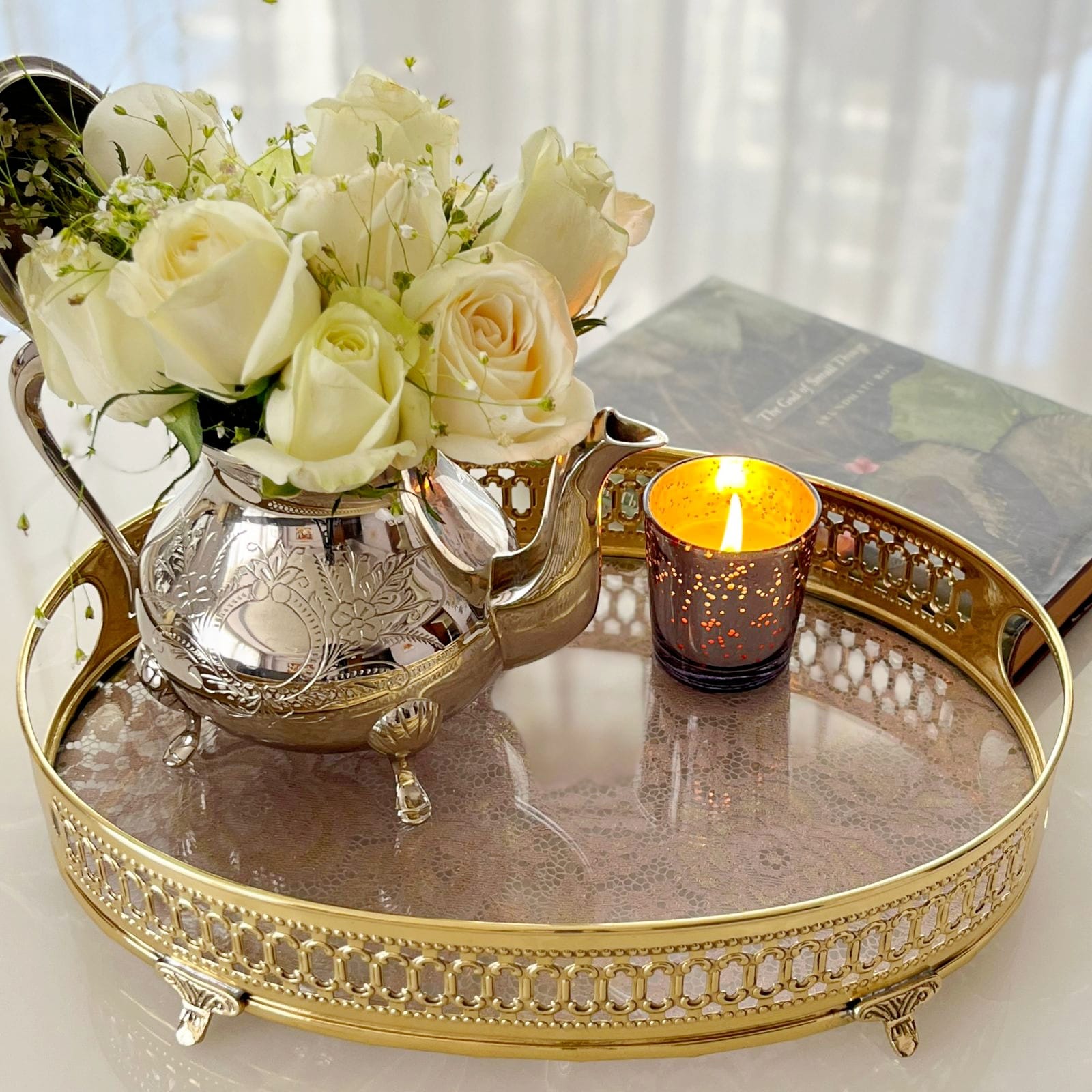 Názm, a delicate and absolutely gorgeous product in our portfolio, means poetry. It clearly delivers to its meaning... the brass placement tray with a delicate fabric. between glass is all grace and grandeur and is our take on vintage yet modern elegance.