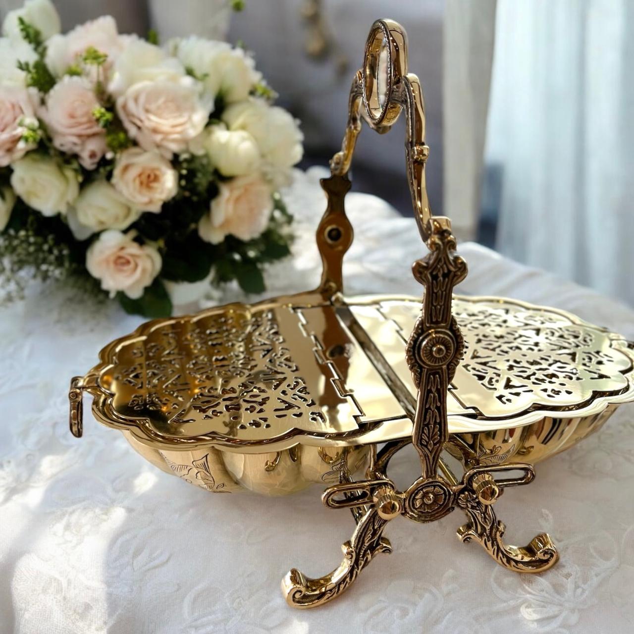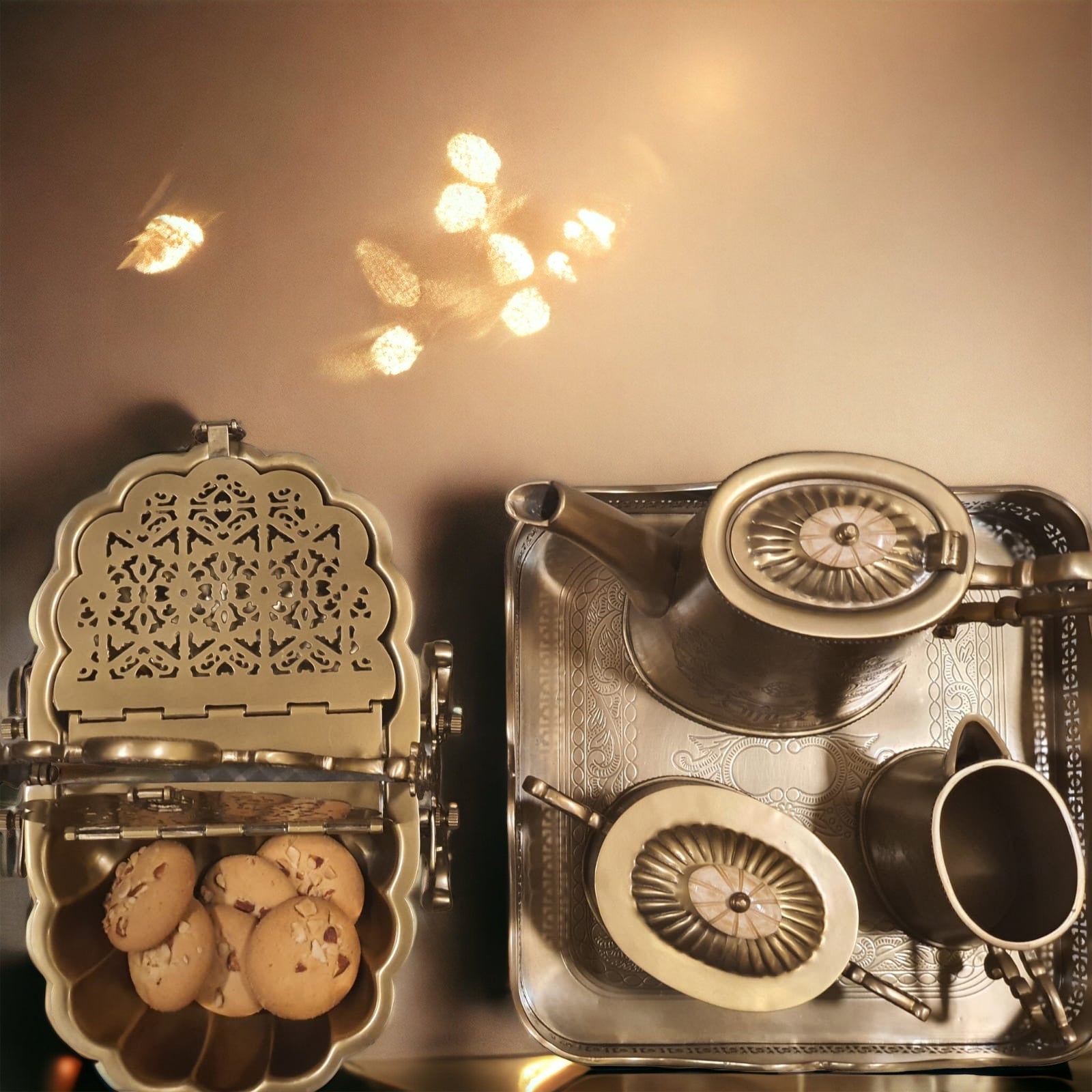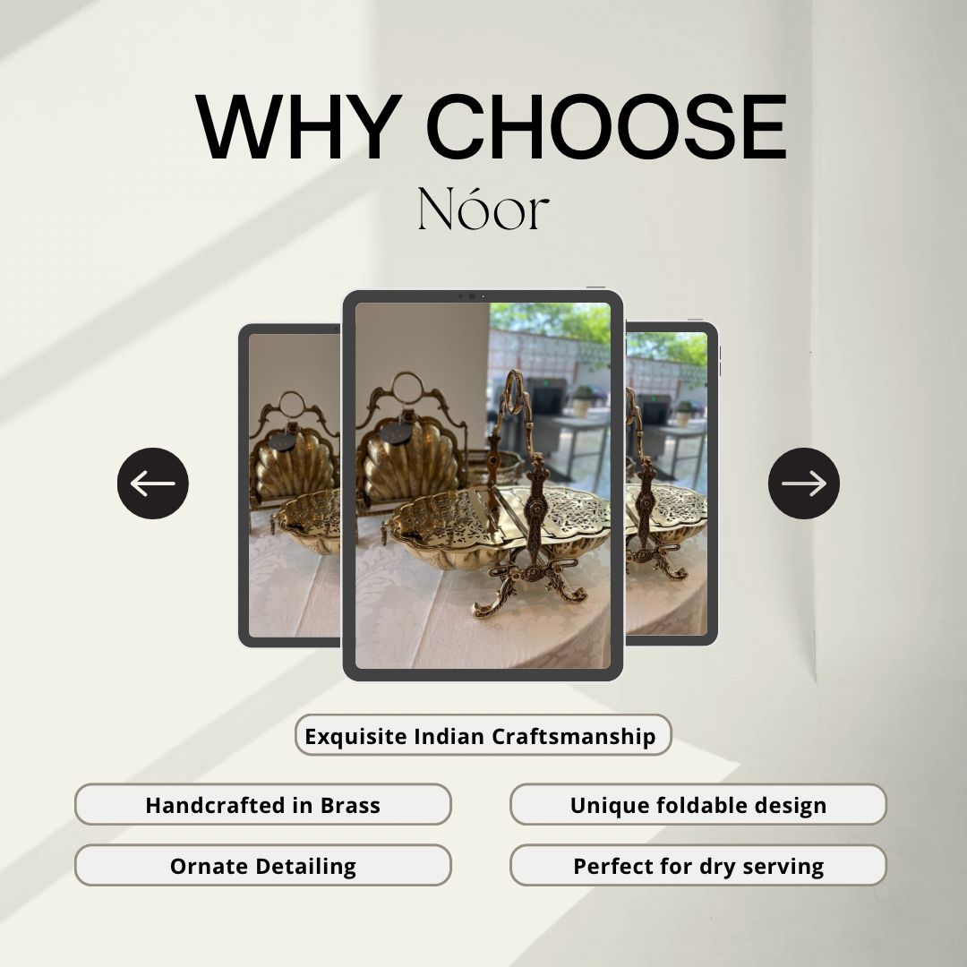 Nóor, a testament to the seamless fusion of artistry and functionality. Meticulously designed for those who appreciate the finer things in life. This captivating piece brings an air of sophistication to your home. Its intricate detailing, reminiscent of timeless craftsmanship, adds a touch of opulence to your gatherings. Perfect for serving an array of delectable cookies and nuts, this box not only elevates your culinary presentation but also becomes a conversation starter in its own right. With every glance, you'll witness the harmonious blend of form and function, making this brass box a must-have for connoisseurs of both art and taste.Versatile and timeless, this collection is a great addition to any home.