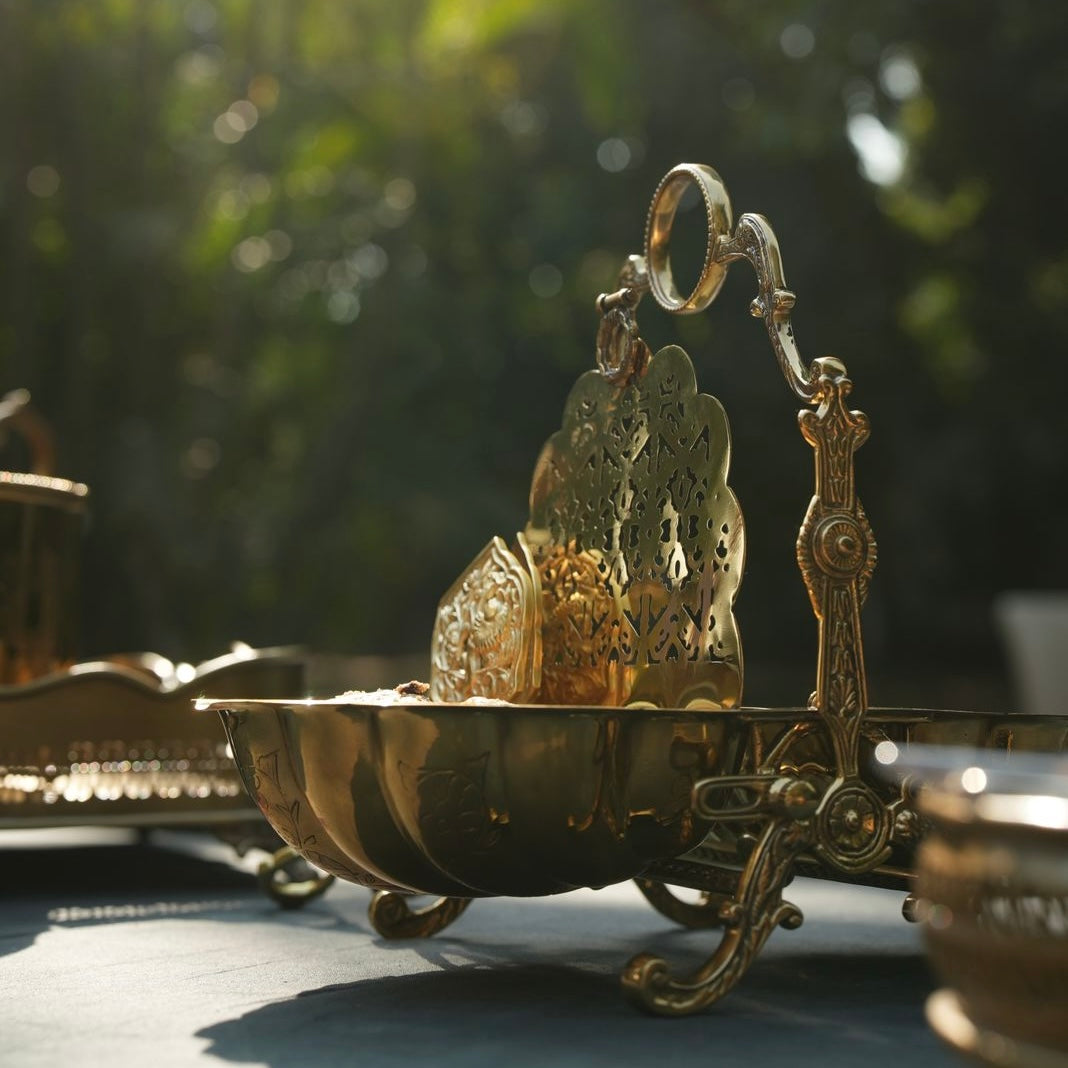 Inspired by the grandeur of ancient India, the Názm Collection of brass trays...