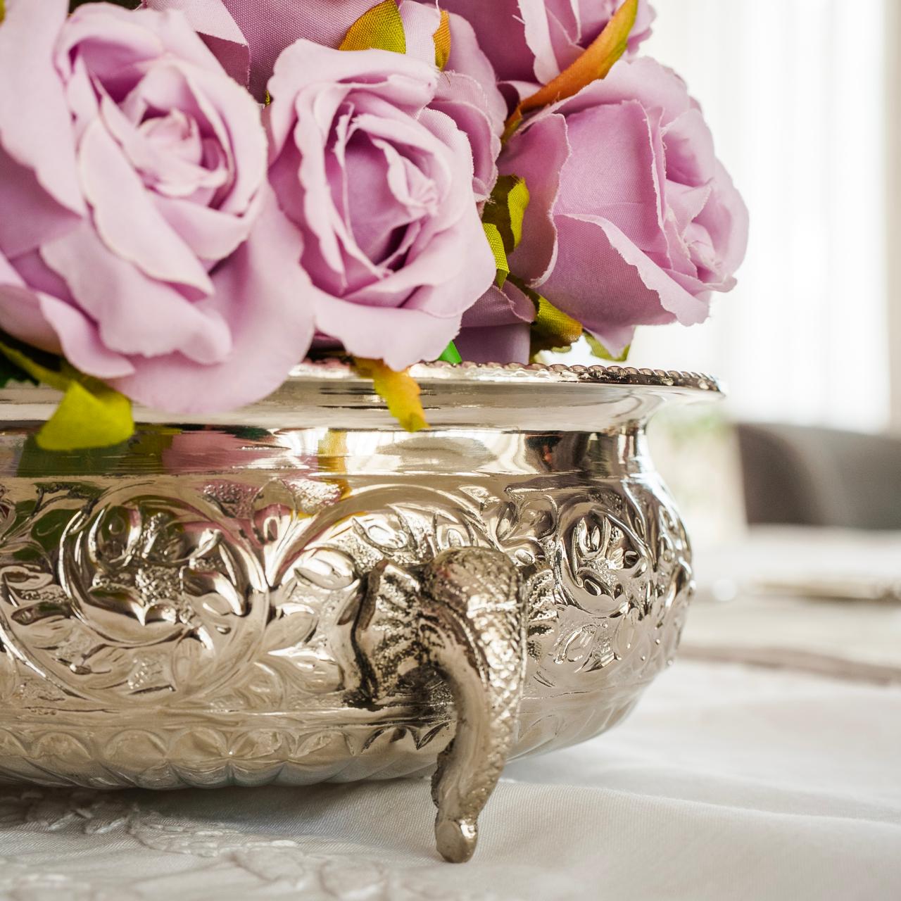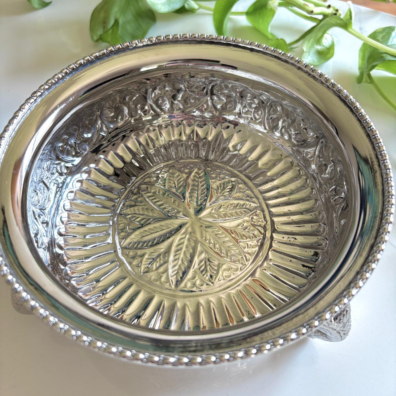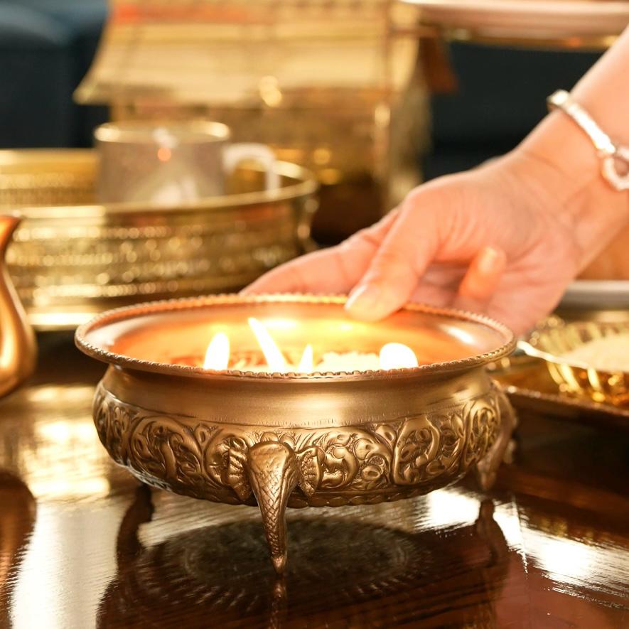 Nurein — a handcrafted brass urli that honors the legacy of traditional artistry. Detailed with exquisite chitai work, each motif bears testament to the patience and finesse of skilled hands. Resting on elephant-trunk shaped legs, it carries with it symbols of strength, prosperity, and grace.