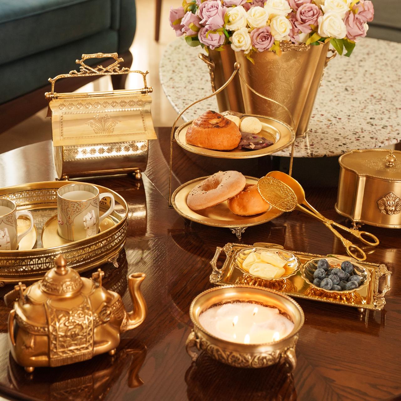 Inspired by the grandeur of ancient India, the Názm Collection of brass trays...
