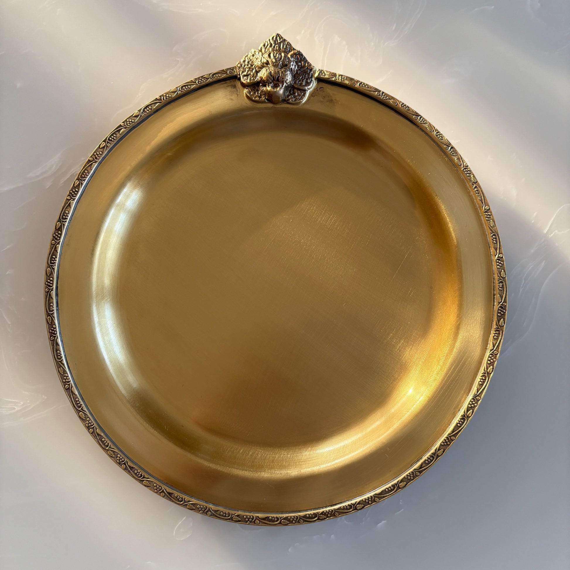 A celebration of timeless artistry, the Shahgul Brass Dinner Plate is a masterpiece of elegance and tradition. Handcrafted in radiant brass, its surface glows with a rich golden sheen, while the delicately embossed rim and ornate motif lend it a regal charm.