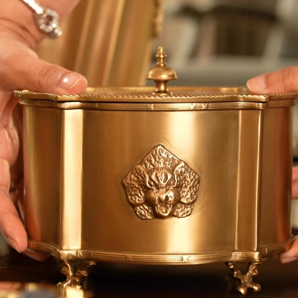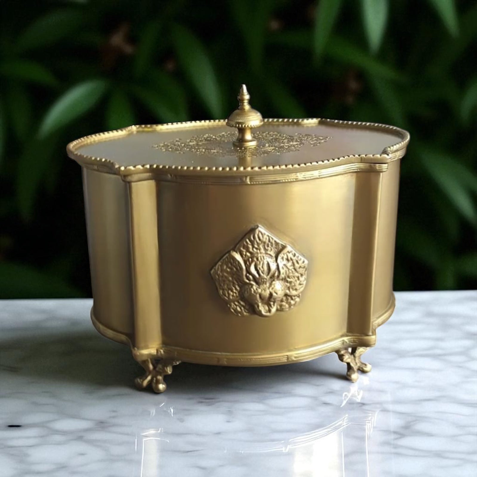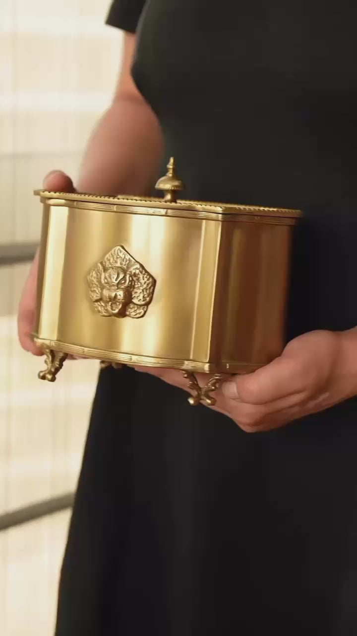 The Shahgul box is a masterpiece in brass, designed to embody the richness of heritage with a touch of luxury. Its elegant form rests gracefully on ornate feet, while the gently scalloped lid and intricate detailing lend it an air of royal refinement.