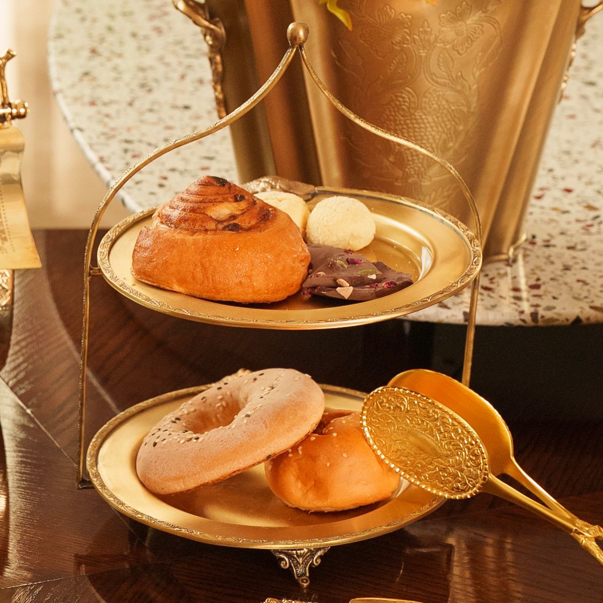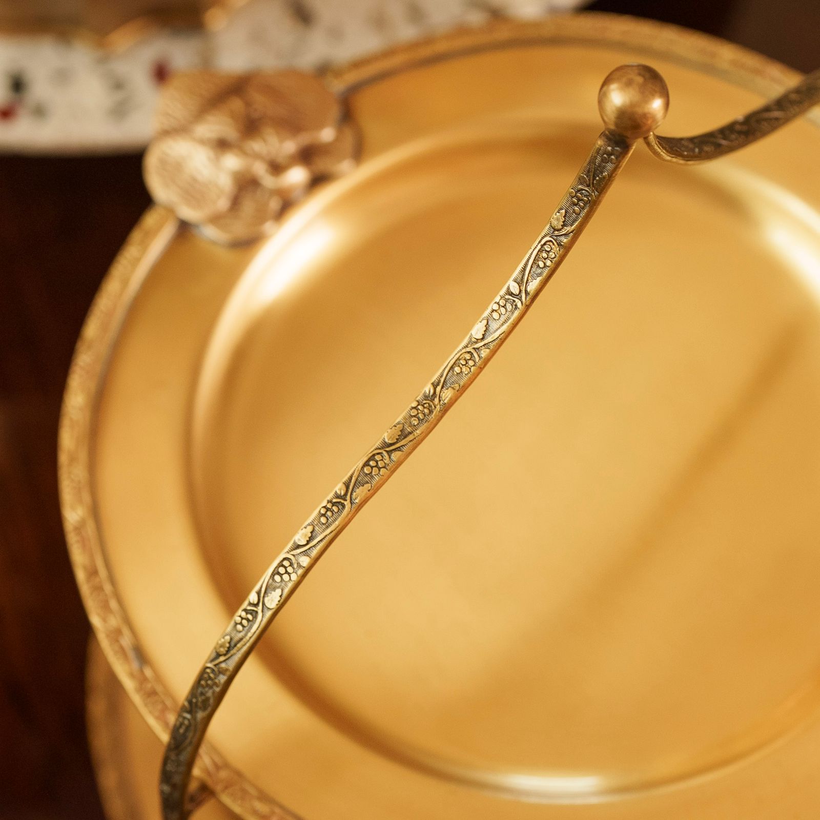 Grace your table with Shahgul, a handcrafted two-tier platter in radiant brass. With its lustrous gleam and finely detailed edges, Shahgul evokes royal sophistication while serving modern gatherings with style. Perfect for presenting mithai, hors d’oeuvres, or festive delicacies, this piece transforms every occasion into a celebration of heritage and elegance.