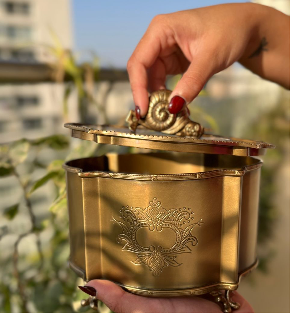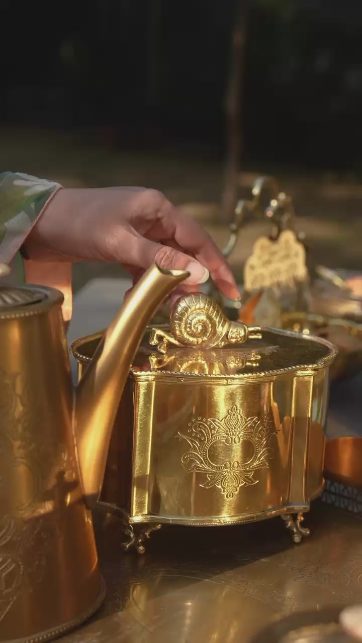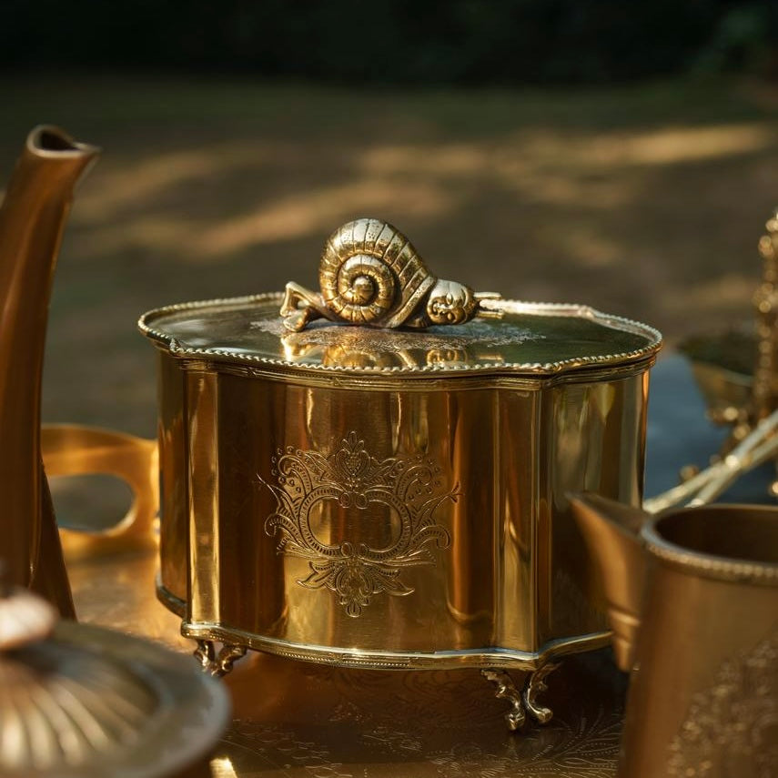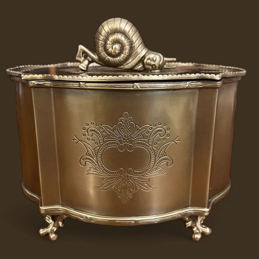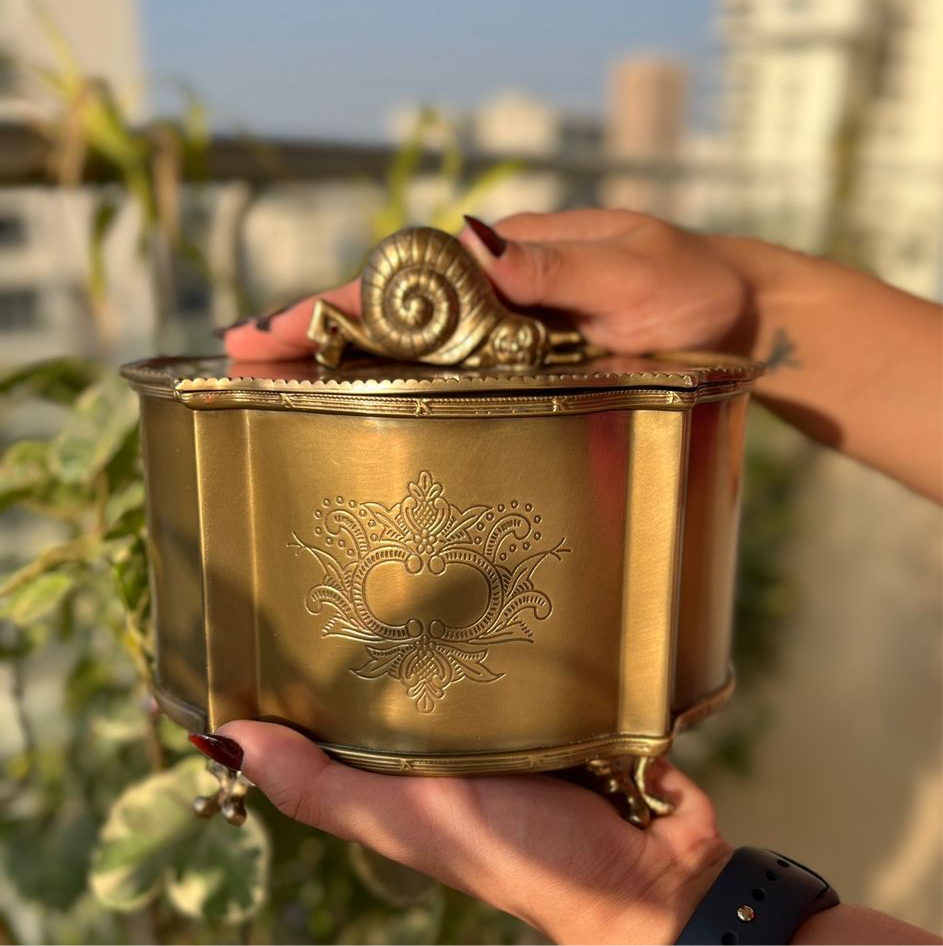Introducing our exquisite Brass Box, a versatile addition to your home decor. Crafted with a vintage finish, this charming piece serves multiple functions, from housing your favorite cookies to storing condiments or safeguarding precious jewelry. Adorned with intricate etching, it exudes timeless elegance, adding a touch of sophistication to any space. What sets it apart is the whimsical baby snail detail adorning the lid as a knob, adding a playful yet elegant accent to this already enchanting piece. Elevate your home decor with our Brass Box, where functionality meets elegance in the most delightful way.