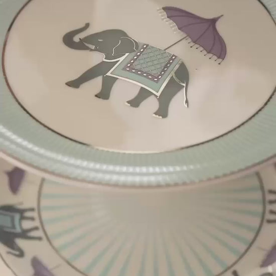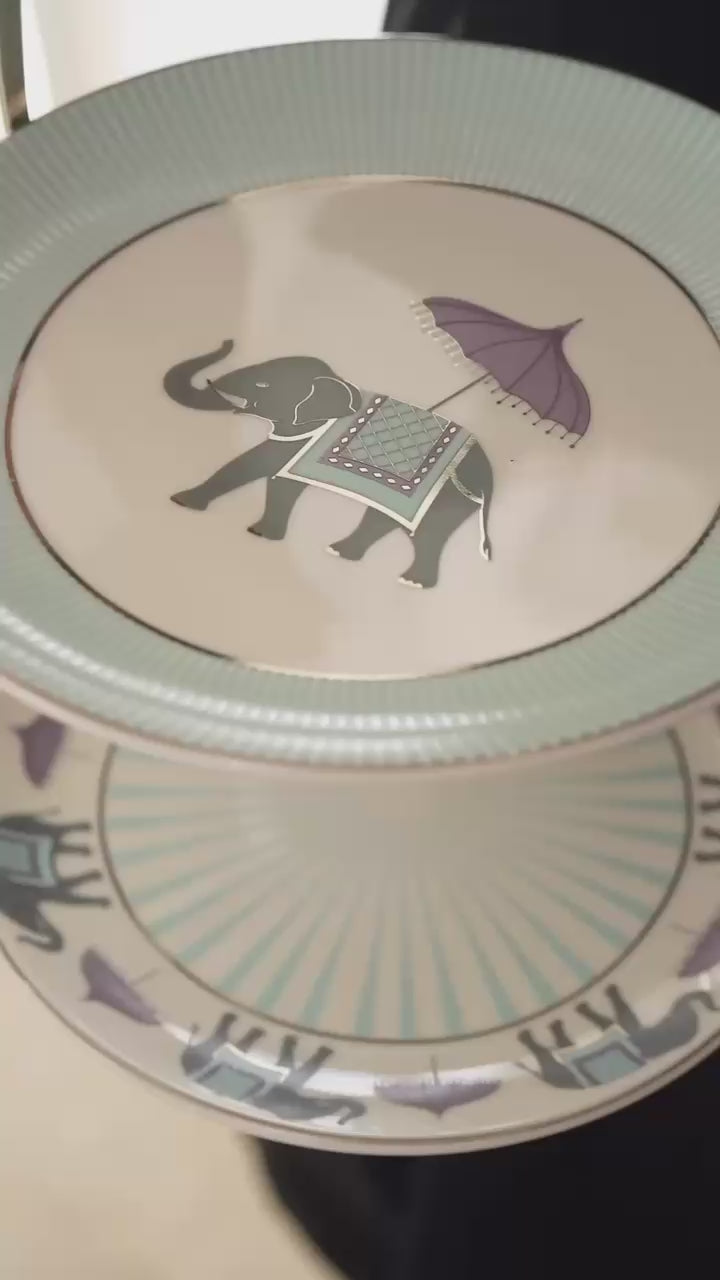 Zerqa is a celebration of refined craftsmanship — a graceful two-tier platter where tradition meets luxury. Its brass stand, embossed with delicate grapevine motifs, reflects timeless abundance, while the porcelain plates are adorned with pure platinum detailing and elegant elephant-inspired artistry.
